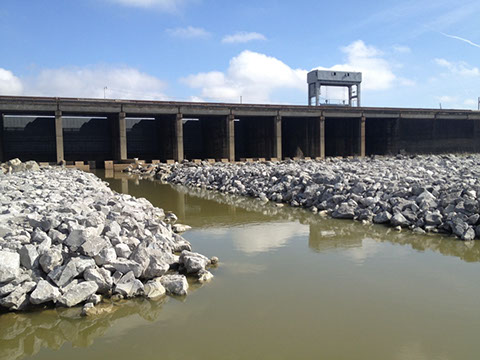 The Morganza Control Structure Scour Repair project involved the repair of previous scour damages, placement of geotextile filter fabric, and placement of approximately 75,000 tons of armor stone to provide protection against future scouring. First, the existing scour damage was graded out by dozer. Crews then installed geotextile filter fabric, which, after the placement of 125LB bedding stone, was keyed in to prevent any future scouring. 2200 LB armor stone was then placed and paved to construct a stability berm and 2-4 ton derrick stone was placed to provide added support to the spillway structure.