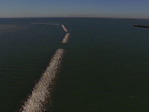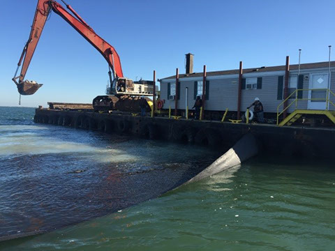 This rock breakwater project consisted of the placement of geotextile and the placement of stone. The project was located in a large open bay adjacent to and affected by weather conditions in the Gulf of Mexico. The project was built in shallow water (3’ to 4’) using light loaded barges.