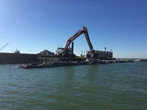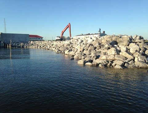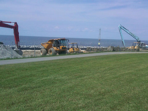 This project consisted of the excavation, segregation, and disposal of over 35,000 tons of regulated and unregulated materials, trucking of materials, placement of geotextile fabrics, removal and disposal of existing piling structures, canal sweeps, excavating slopes to meet specified lines and grades, placement and management of turbidity curtain, on site segregation of stone gradations, placement of filter and armor stones to construct scour protection and to redirect water flow from the canal by means of a training berm.
