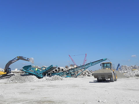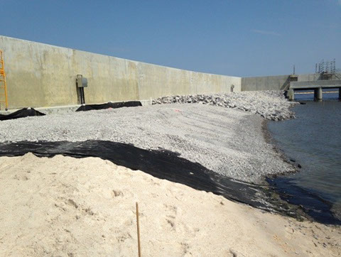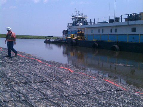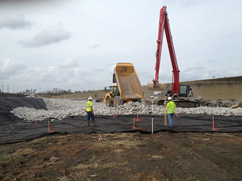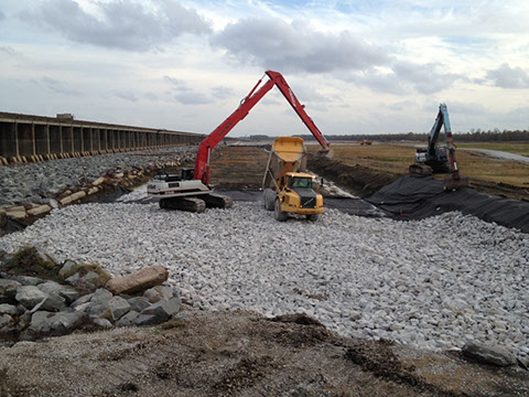 Dismantled and removed the old I-10 Twin Span bridge, breaking and screening the concrete rubble into graded base and riprap material. Graded Riprap rubble used to fill 5’x1.5’x39’ geogrid mattresses and placed on approximately 39,275 lf of shoreline.