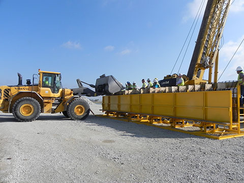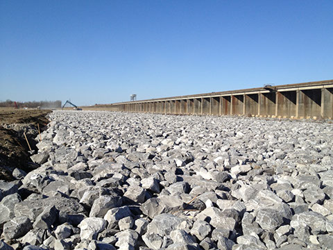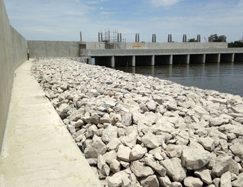 The Morganza Control Structure Scour Repair project involved the repair of previous scour damages, placement of geotextile filter fabric, and placement of approximately 75,000 tons of armor stone to provide protection against future scouring. First, the existing scour damage was graded out by dozer. Crews then installed geotextile filter fabric, which, after the placement of 125LB bedding stone, was keyed in to prevent any future scouring. 2200 LB armor stone was then placed and paved to construct a stability berm and 2-4 ton derrick stone was placed to provide added support to the spillway structure.